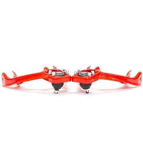 BLOX Racing adjustable front camber kits are designed to replace the vehicle’s factory upper control arms. BLOX Racing adjustable front camber kits allow the user to adjust and fine tune the front suspension’s camber settings for optimum driving and cornering performance. By properly adjusting the front camber settings, premature and uneven tire wear can be reduced while greater tire contact patch can be created. Whether you are street driving, road racing or drag racing, BLOX Racing front adjustable camber kits will help you fine tune your front suspension settings easily and quickly. BLOX Racing front camber kit feature standard sliding ball joints and Competition sliding ball joints. Each camber kit is powder-coated for durability.