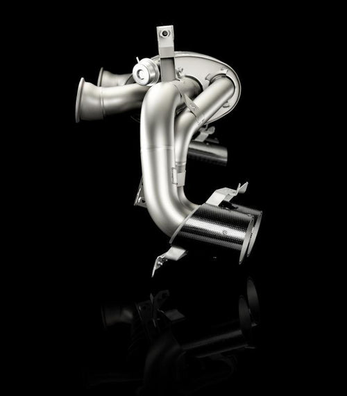 The precision-engineered titanium alloy Slip-On performance exhaust system reduces the weight of this supercar and improves handling. We’ve extracted additional power through improved gas-flow dynamics and a drop in back pressure. To complement our muffler design, we’ve added our well-known cast titanium dual-mode exhaust valves to create a virtual symphony from the large displacement V10. If no optional Akrapovic sound kit for adjustable sound is used, at lower engine speeds and during cruise operation the valves are closed and produce a deeper and sharper exhaust note. At wide-open throttle the valves open, releasing the full fury of the engine. The driver can control the sound with the Akrapovic sound kit. Complete the look with a set of four exquisite tailpipes in carbon fibre.