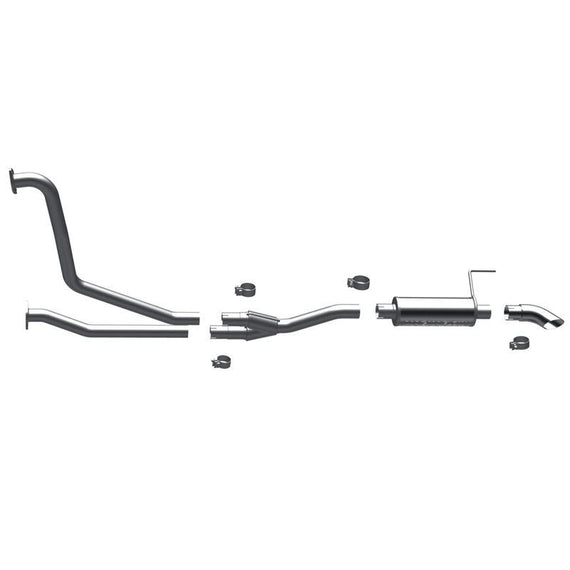 MagnaFlow Off-Road Pro series systems turn down before the axle design. The turndown provides an aggressive exhaust note and allows for usage on vehicles with highly modified suspension systems. The MagnaFlow Off-Road Pro series turndown systems provide the versatility to accommodate nearly every configuration, including lifted, lowered, air bagged, and long travel. Additionally, they are engineered for maximum power and minimal weight. These systems also eliminate the need for custom fabrication with true bolt-on fitment. Increase performance and turns heads with MagnaFlow Off-Road Pro series turndown systems.