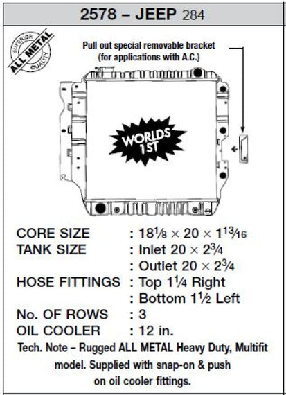 CSF 2578 All-Metal Heavy-Duty 4-Row Radiator for Jeep Wrangler 2.5L & 4.0L 2578