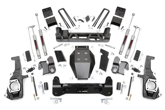 Front: Front and rear crossmembers, lifted knuckles, differential skid plate, differential drop brackets, NTD brackets, sway bar link extensions, sway bar relocation brackets, upper shock brackets, extended brake lines, and hardware; Rear: Lift blocks, u-bolts, bump stop brackets, brakeline/e-brake brackets, and hardware; Shocks: (4) Premium N3 Shocks
