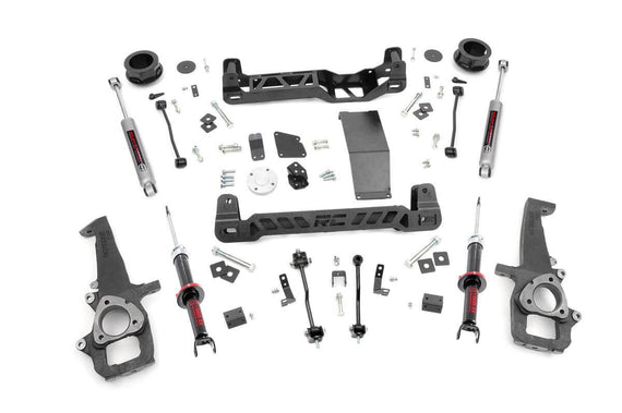 Give your RAM 1500 the perfect blend of performance, protection, and style with Rough Country's 4-inch Suspension Lift. Designed to offer an affordable way to maximize off-road performance and run up to 35-inch tires, these kits offer high quality, heavy-duty equipment for new model RAM 1500's. Utilizing heavy-duty, laser cut, steel equipment engineered by Rough Country, these 4-inch Suspension Lifts are complete kits that include everything needed for outstanding off-road performance. High-clearance front and rear cross-members provide enough room for off-road climbs and runs. A heavy-duty skid plate shields the vehicle's differential, protecting you from hazardous terrain. A durable set of driver and passenger side lifted cast knuckles are also included, helping to promote proper geometry once the vehicle is lifted. And for true trailblazers, this kit also ships with a set of rear Performance 2.2 shock absorbers - Rough Country's premiere shocks; valved specifically for unparalleled off-road performance. Best of all? You'll achieve better performance, bigger tires, and considerable protection all without sacrificing the look of your truck. All components are specifically designed to keep things nice and tidy underneath, utilizing drop brackets to promote proper geometry and leaving nothing hanging out in plain sight. The beefy cross members feature a laser-cut RC logo, giving the truck a fierce, but streamlined look after lifting. Includes Rough Country's Lifetime Replacement Guarantee!