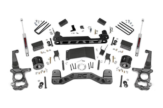 Give your 2015-2016 Ford F-150 an aggressive new look and unparalleled off-road performance with Rough Country's 4-inch Suspension Lift. This all-inclusive kit features everything needed to take your Ford off the freeway and into the fields.Featuring a set of durable lifted knuckles and strut spacers, you'll gain enough ride height to run up to 33-inch tires with proper wheel spacing! A set of differential drop brackets, sway-bar drop brackets, brake line brackets, and a drive shaft spacer help keep everything at optimum angles for a factory-like ride, even after lifting. A 1/4-inch thick plate steel front and rear crossmember bring uncompromised strength and good looks to your truck, and are updated to fit the new F-150 design. Our Fabricated Rear Blocks offer considerably more strength than their cast iron counterparts, and were specifically engineered by Rough Country to prevent against axle-wrap. A set of Rough Country's premium off-road shock absorbers - N3 - are also included in this kit, featuring a large diameter body with a chrome-hardened piston rod and long-lasting polyurethane bushings.Best of all, Rough Country's 2015 Ford F-150 Lift Kit is backed by our Lifetime Replacement Warranty.