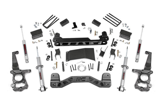 Give your 2015-2016 Ford F-150 an aggressive new look and unparalleled off-road performance with Rough Country's 4-inch Suspension Lift. This all-inclusive kit features everything needed to take your Ford off the freeway and into the fields.Featuring a set of durable lifted knuckles and strut spacers, you'll gain enough ride height to run up to 33-inch tires with proper wheel spacing! A set of differential drop brackets, sway-bar drop brackets, brake line brackets, and a drive shaft spacer help keep everything at optimum angles for a factory-like ride, even after lifting. A 1/4-inch thick plate steel front and rear crossmember bring uncompromised strength and good looks to your truck, and are updated to fit the new F-150 design. Our Fabricated Rear Blocks offer considerably more strength than their cast iron counterparts, and were specifically engineered by Rough Country to prevent against axle-wrap. A set of Rough Country's premiere off-road shock absorbers - Performance 2.2's - are also included in this kit, featuring a large 2.2-inch diameter body with a chrome-hardened piston rod and long-lasting polyurethane bushings.Best of all, Rough Country's 2015 Ford F-150 Lift Kit is backed by our Lifetime Replacement Warranty.