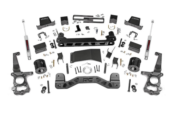 Give your 2015-2016 Ford F-150 an aggressive new look and unparalleled off-road performance with Rough Country's 5-inch Suspension Lift. This all-inclusive kit features everything needed to take your Ford off the freeway and into the fields.Featuring a set of durable lifted knuckles and strut spacers, you'll gain enough ride height to run up to 35-inch tires with proper wheel spacing! A set of differential drop brackets, sway-bar drop brackets, brake line brackets, and a drive shaft spacer help keep everything at optimum angles for a factory-like ride, even after lifting. A 1/4-inch thick plate steel front and rear crossmember bring uncompromised strength and good looks to your truck, and are updated to fit the new F-150 design. Our Fabricated Rear Blocks offer considerably more strength than their cast iron counterparts, and were specifically engineered by Rough Country to prevent against axle-wrap.A set of Rough Country's premium off-road shock absorbers - N3 - are also included in this kit, featuring a large diameter body with a chrome-hardened piston rod and long-lasting polyurethane bushings.Best of all, Rough Country's 2015 Ford F-150 Lift Kit is backed by our Lifetime Replacement Warranty.