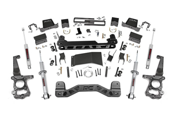 Give your Ford F-150 an aggressive new look and unparalleled off-road performance with Rough Country's 6-inch Suspension Lift. This all-inclusive kit features everything needed to take your Ford off the freeway and into the fields.Featuring a set of durable lifted knuckles and strut spacers, you'll gain enough ride height to run up to 35-inch tires with proper wheel spacing! A set of differential drop brackets, sway-bar drop brackets, brake line brackets, and a drive shaft spacer help keep everything at optimum angles for a factory-like ride, even after lifting. A 1/4-inch thick plate steel front and rear crossmember bring uncompromised strength and good looks to your truck, and are updated to fit the new F-150 design. Our Fabricated Rear Blocks offer considerably more strength than their cast iron counterparts, and were specifically engineered by Rough Country to prevent against axle-wrap. A set of Rough Country's premiere off-road N3 shock absorbers are also included in this kit.Best of all, Rough Country's Ford F-150 Lift Kit is backed by our Lifetime Replacement Warranty.