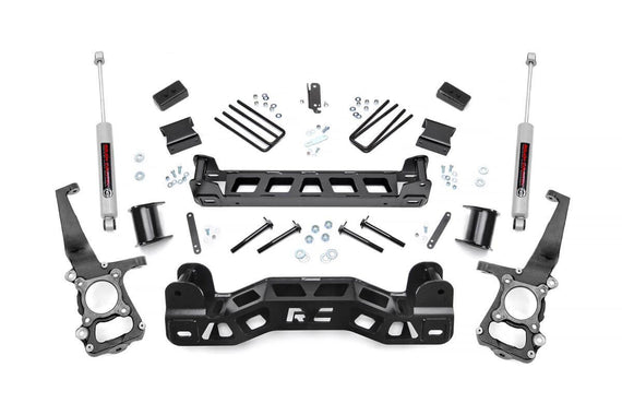 Give your 2WD 09-14 Ford F-150 an aggressive new look and unparalleled off-road performance with Rough Country's 4-inch Suspension Lift. This all-inclusive kit features everything needed to take your Ford off the freeway and into the fields. Featuring a set of durable lifted knuckles and strut spacers, you'll gain enough ride height to run up to 33-inch tires! A 1/4-inch thick plate steel high clearance front and rear cross member bring uncompromised strength and good looks to your truck, featuring a laser-cut "RC" logo and an easy-to-install design. Our Fabricated Rear Blocks offer considerably more strength than their cast iron counterparts, and were specifically engineered by Rough Country to prevent against axle-wrap. A set of Rough Country's premiere off-road shock absorbers are also included in this kit. No cutting or drilling required to install, and best of all this kit is backed by Rough Country's Lifetime Replacement Warranty!