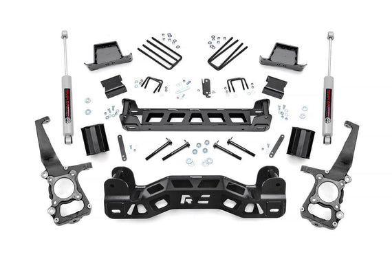 Give your 2WD 09-14 Ford F-150 an aggressive new look and unparalleled off-road performance with Rough Country's 6-inch Suspension Lift. This all-inclusive kit features everything needed to take your Ford off the freeway and into the fields. Featuring a set of durable lifted knuckles and strut spacers, you'll gain enough ride height to run up to 35" tires! A 1/4-inch thick plate steel high clearance front and rear cross member bring uncompromised strength and good looks to your truck, featuring a laser-cut "RC" logo and an easy-to-install design. Our Fabricated Rear Blocks offer considerably more strength than their cast iron counterparts, and were specifically engineered by Rough Country to prevent against axle-wrap. A set of Rough Country's premiere off-road shock absorbers are also included in this kit. No cutting or drilling required to install, and best of all this kit is backed by Rough Country's Lifetime Replacement Warranty!