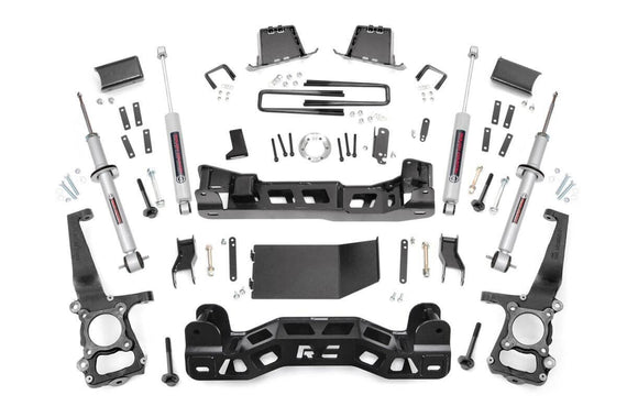 Give your 2014 Ford F-150 an aggressive new look and unparalleled off-road performance with Rough Country's 6-inch Suspension Lift. This all-inclusive kit features everything needed to take your Ford off the freeway and into the fields. Featuring a set of durable lifted knuckles and strut spacers, you'll gain enough ride height to run up to 35-inch tires! A set of differential drop brackets, sway-bar drop brackets, brake line brackets, and a drive shaft spacer help keep everything at an optimum angle for a factory-like ride, even after lifting. A 1/4-inch thick plate steel front and rear cross member bring uncompromised strength and good looks to your truck, featuring a laser-cut "RCX" logo and an easy-to-install design. Our Fabricated Rear Blocks offer considerably more strength than their cast iron counterparts, and were specifically engineered by Rough Country to prevent against axle-wrap. A set of Rough Country's premiere off-road shock absorbers - Performance N3's - are also included in this kit, featuring a large N3-inch diameter body with a chrome-hardened piston rod and long-lasting polyurethane bushings.