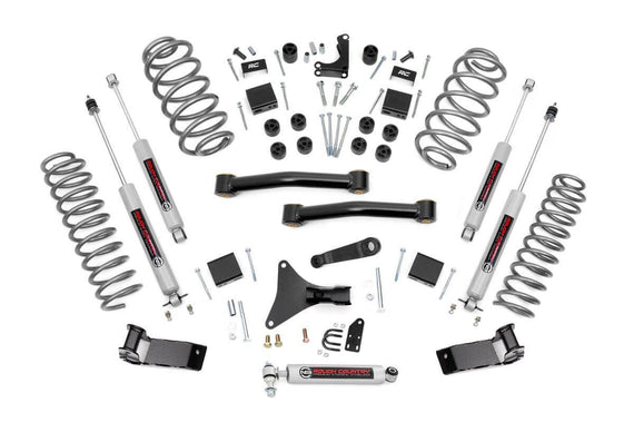 FRONT: Lifted coil springs, Fixed lower control arms, Lower control arm drop brackets, Pitman arm, Track bar drop bracket w/uni-body brace, Bumpstop extensions, Transmission crossmember spacers, Premium N2.0 steering stabilizer, Hardware; REAR: Lifted coil springs, Upper control arm bracket, Sway-bar brackets, Bumpstop extensions, Shock relocation kit, Hardware; SHOCKS: (4) Premium N3 Series