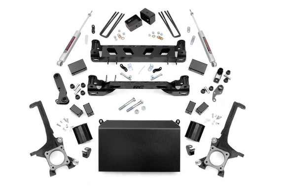 Take your Toyota Tundra to the next level with Rough Country's 4.5in Suspension Lift for 07 & up models. With heavy-duty components and a high-clearance design, this kit offers aggressive looks, unparalleled off-road performance, and enough ride height to run up to 35in tires.Instantly gain a meaner lifted and level stance with high-quality equipment that's made to handle the hazards of high-performance while withstanding the test of time. A set of durable lifted knuckles, high-clearance front and rear crossmembers, upper strut spacers, and long-lasting, fabricated rear blocks give you plenty of lift and uncompromised toughness.This all-inclusive kit features everything you need to take your Tundra off the tread and through the trenches; featuring steering stops, brake line brackets, differential drop brackets, sway-bar drop brackets, and anything else one would need to keep everything working at optimum angles after lifting. Best of all, you can get up and running with Rough Country's 4.5in Toyota Tundra Lift at a price that won't break the bank!