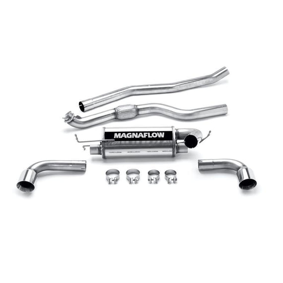 These MagnaFlow performance exhaust systems are as rugged and reliable as the vehicle that you drive. These exhaust kits feature OEM-style barbed hangers for easy installation, mandrel bends to prevent exhaust flow restrictions, and MagnaFlow's legendary straight-through, wide-open, stainless steel muffler to provide a smooth, deep tone outside of the vehicle. All MagnaFlow exhaust systems are factory-checked for proper fitment and dyno-tested to verify performance gains. These kits include all necessary installation hardware and some include a polished stainless steel exhaust tip.
