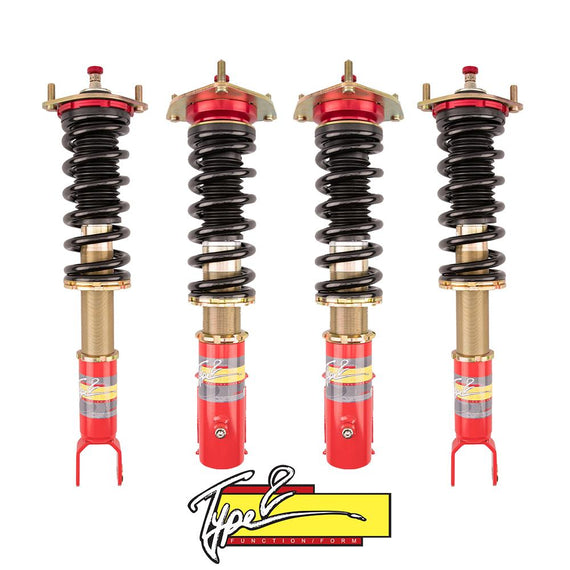 Full-bodied coilover: All Function and Form kits are full-bodied coilovers built for street performance and weekend track enthusiasts. 32-level adjustable damping: Function & Form Type 2 are the ultimate street inspired full-bodied coilovers with 32-levels of damping to provide the precise control when modifying ride quality and handling.Steel Collars and Spring Perches for High Durability and Hardness: All Function and Form coilovers are built with corrosion resistant zinc plated steel collars, spring perches, and shock body. Steel is the prefered material for ensured durability and is harder than aluminum, performing better under weight, force, and heat.Adjustable Lower Mount: All Function and Form coilovers feature a threaded shock body and adjustable lower mounts. Which allow for height adjustments from the lower mount without sacrificing the shock travel. F2 Red Powder Coating: Signature red lower mounts are protected with an extremely strong and corrosion resistant powder coating technique. Function and Form lower mounts provide a durable barrier against all weather elements. Pillowball Top Mount: Select applications for vehicles with McPherson style suspension will feature a pillowball top mount assembly.Pillowball Top Mount: Select applications for vehicles with McPherson style suspension will feature a pillowball top mount assembly.Twin-Tube Technology for Increased Piston Stroke: Vehicle applications equipped with twin-tube damping design have an inner working cylinder - providing excellent handling & control characteristics for most driving conditions.Shock Dust Boot: Polyurethane dust boots are specifically fitted to help keep out harmful road contaminants. Dust boots and bump stops are standard for all Function and Form coilovers. Industry Leading 24-month Limited Warranty: At Function and Form we stand behind our products. All coilovers are covered under a 24-months limited warranty against manufacturer defect*.
