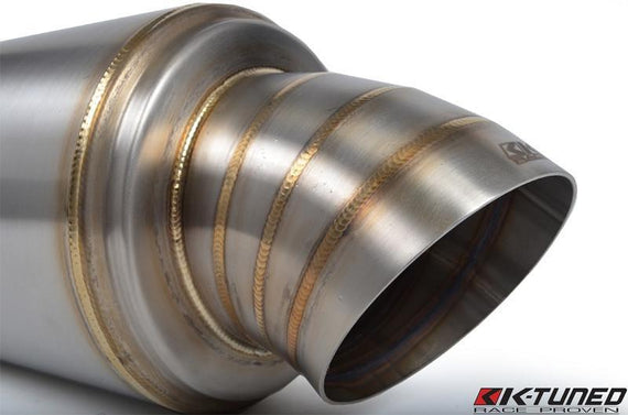 This muffler features a 3.5" diameter turndown style tip. The tip is made from 3 individual pie cut pieces that are beautifully tig welded together. Back purge tig welding is used to keep the welds super clean, ensure proper penetration and weld strength. The whole muffler is finished in brushed stainless steel with our K-Tuned logo etched across the top of the tip. The compact 5.5" diameter round body design is perfect for installation in tight spaces and also offers a 5lbs weight reduction over larger oval style mufflers.