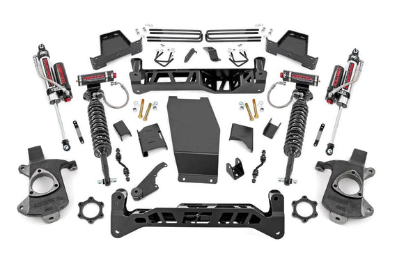 Get the look you really want with Rough Country's 7-inch Suspension Kit for 4WD '14+ Chevy / GMC 1500 Pickups. This massive kit affords your truck the ability to run 35-inch tires on factory wheels with our beefy lifted knuckles and is designed with 100% laser-cut materials for the best possible fit on your vehicle.Includes a set of front and rear high-clearance cross members featuring the "RC" logo and a differential skid-plate. Each kit also comes with a set of durable, fabricated anti-wrap lift blocks that offer a huge boost while helping prevent axle wrap issues.Give your pickup an aggressive, lifted and level stance with incredible ride quality! Our innovative Lifted Knuckle design boosts ride height while keeping all components at the optimum angles for a factory-like ride. This kit includes a set of rear N3 Shocks, balanced for on and off-road use. Includes Rough Country's Lifetime Replacement Warranty.