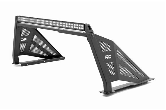 Transform your truck with Rough Country's GM Sport Bar! This head-turning upgrade offers incredible style and aggressive good looks that's sure gather lots of attention. With a solid-steel construction and geometric design, Rough Country's Sport Bar is a durable add-on accessory that blends in perfectly with modern truck stylings.Each kit features a driver side and passenger side support brace with mesh accents and a laser-cut "RC" logo for unique good looks. Upgrade your Sport Bar with an optional 50" Black or Chrome Series LED Light bar for incredible forward-facing illumination, or run the bar by itself for a sleeker look. The durable cross brace is fully customizeable, featuring several pre-drilled holes allowing you to mount any type of LED accessory that uses a standard pillar mount such as a series of 2" LED cubes for a unique look!Rough Country's GM Sport Bar is easy to install with only slight drilling required, and connects snugly to your bed railing for a sturdy fit. Includes Rough Country's Lifetime Replacement Guarantee.