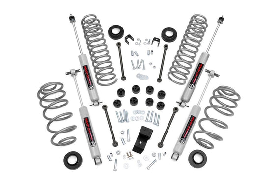 Clears up to 33-inch tires; 100% Bolt-on installation; Increased ground clearance; Kit contains 4 Premium N3 series shocks; Levels the front with the rear of the Jeep; Springs are progressive rate for enhanced ride quality