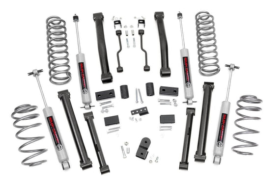 Front: Lifted coil springs, lower fixed control arms, bumpstop extensions, sway bar links and brackets, and hardware; Rear: Lifted coils springs, upper and lower fixed control arms, bumpstop brackets, sway bar brackets, brakeline relocation bracket, and track bar bracket; Shocks: (4) Premium N3 Shocks